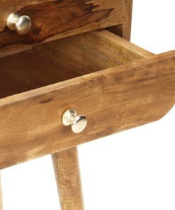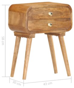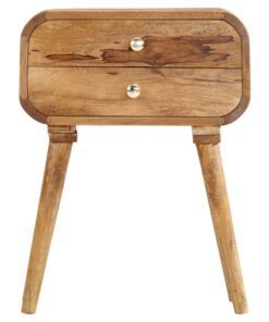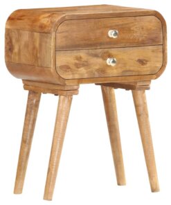 Het nachtkastje is gemaakt van massief mangohout en heeft, dankzij de mooie afwerking van polijsten en lakken, een verfijnde uitstraling. Mangohout is een dicht en robuust hardhout dat prachtige bruine of gouden strepen en contouren heeft. De 2 lades bieden voldoende opbergruimte om je spulletjes georganiseerd en binnen handbereik te houden.