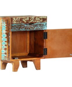 Dit kleurrijke nachtkastje met handgesneden patroon in antieke stijl is gemaakt van teruggewonnen hout dat afkomstig is van balken, vloeren en steunbalken van oude gebouwen die afgebroken zijn. Het bestaat dus uit verschillende houtsoorten, zoals grenen, teak, beuken, eiken, ceder, mangohout en acacia. Dit betekent dat het teruggewonnen hout de kenmerken van deze verschillende houtsoorten behoudt. Gerecycled hout is al verouderd, verweerd en gedroogd, waardoor het niet krimpt of buigt. Elke stap van het proces wordt met de grootste zorg uitgevoerd, of het nu schilderen, polijsten of lakken is. Het voortreffelijke vakmanschap en de sierlijke houtnerven maken elk meubel onderscheidend en iets anders dan de rest. Bovendien onderscheidt dit vintage nachtkastje zich door 1 lade en 1 deur en biedt hij een ideale oplossing om je spulletjes geordend en binnen handbereik te houden. De kast is eenvoudig te monteren.