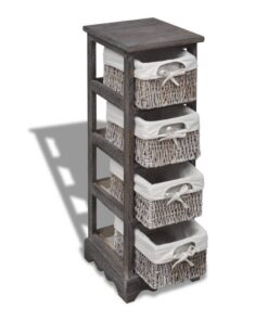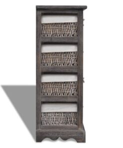 Dit kastje wordt compleet met 4 geweven manden geleverd en biedt meer dan genoeg ruimte om je spullen te bewaren. Tegelijkertijd geeft het meubelstuk ook een beetje stijl aan de kamer. Ons houten kastje wordt zeker een van je favoriete meubelstukken.