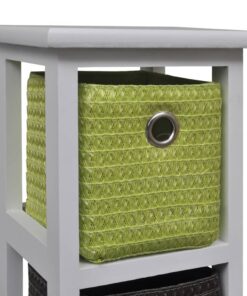 Dit duurzame houten meubel heeft 4 weefmanden in verschillende kleuren en biedt voldoende ruimte voor het opbergen van je spullen. Het houten frame heeft een stevig blad waarop je decoratieve voorwerpen kunt plaatsen.