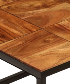 Deze tafel is gemaakt van massief acaciahout en staal, waardoor hij zeer stabiel en duurzaam is. Elke stap van het proces wordt met de grootste zorg uitgevoerd, of het nu gaat om polijsten, schilderen of lakken. Het vakmanschap en de esthetisch aantrekkelijke houtnerven maken elk meubel sui generis en net iets anders dan de rest. Hij kan eenvoudig worden schoongemaakt met een vochtige doek. De montage is eenvoudig.