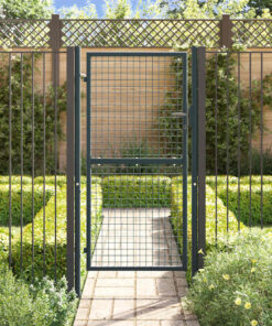 Het tuinhek is hoogwaardig afgewerkt en vervaardigd uit gegalvaniseerd staal met een gepoedercoate afwerking die roestbestendig is en een stevige constructie vormt. Er zitten twee zijpalen aan met boutscharnieren, zodat het eenvoudig te installeren is.