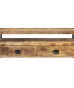 Dit tv-meubel in vintage stijl is gemaakt van massief mangohout, waardoor het zeer stabiel en duurzaam is. Mangohout is een dicht en robuust hardhout met prachtige bruine of gouden strepen en contouren op het oppervlak. Elke stap van het proces wordt met de grootste zorg uitgevoerd, of het nu gaat om polijsten, schilderen of lakken. Dankzij het versterkte stalen frame is de tv-standaard extreem stabiel. Het meubel heeft twee lades voor het bewaren van snuisterijen en een plank voor het bewaren van multimedia-apparaten, spelconsoles en tijdschriften. De tv-kast kan ook worden gebruikt als wandkast, hifi-kast, enz.
