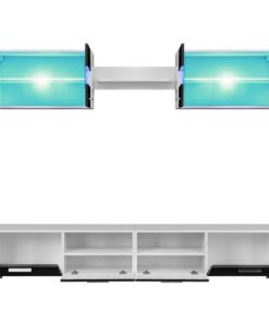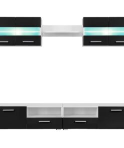 De set, bestaande uit 2 wandkasten, 1 wandplank en 1 tv-meubel die uit 2 kasten bestaat, biedt voldoende ruimte om je multimedia-apparaten, dvd-speler, mediadragers, boeken en allerlei kleinere voorwerpen op te bergen. Hij is ook ideaal voor het plaatsen van decoratieve objecten, fotolijsten en zelfs potplanten. Elke wandkast heeft een glazen schap met energiezuinige LED-verlichting om een aantrekkelijke sfeer te creëren. De tv-kasten hebben valdeurtjes.