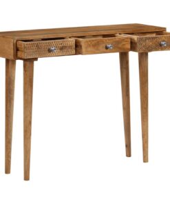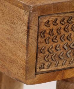 De tafel is gemaakt van massief mangohout en is zeer duurzaam. Mangohout is een sterk en stevig hardhout met prachtige bruine of gouden strepen en rondingen op het oppervlak. Het stevige blad is ideaal voor het plaatsen van enkele decoratieve spullen, zoals vazen en potplanten. Deze lades bieden voldoende opbergruimte om verschillende spullen overzichtelijk te houden. De prachtige handgesneden patronen op de ladefront dragen bij aan de rustieke charme van de tafel. Elke stap van het constructieproces wordt met de grootste zorg uitgevoerd, of het nu polijsten, schilderen of lakken is. De wandtafel is eenvoudig te monteren.