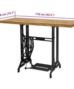 Dit meubilair is prachtig vervaardigd met een originele, gietijzeren basis met naaimachine-ontwerp en een massief tafelblad met teak-kleurige afwerking. Hierdoor heeft het een onderscheidend karakter gekregen. De tafel zorgt voor hoge stabiliteit en duurzaamheid. Op het brede tafelblad kun je decoratieve spullen, zoals fruitmanden, vazen en andere voorwerpen plaatsen. Daarnaast is het pedaal van de naaimachine beweegbaar en kunnen de wielen ronddraaien wanneer je je voet erop zet.