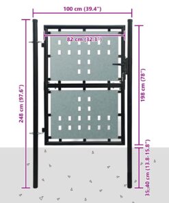 De galvaniseerde platen met decoratieve patronen versterken het frame zodat onze tuinpoort veel veiligheid biedt, terwijl hij tegelijkertijd een fantastische toegangspoort tot je terrein vormt. De poort is gemaakt van sterk gepoedercoat staal dat roest- en uv-bestendig is.