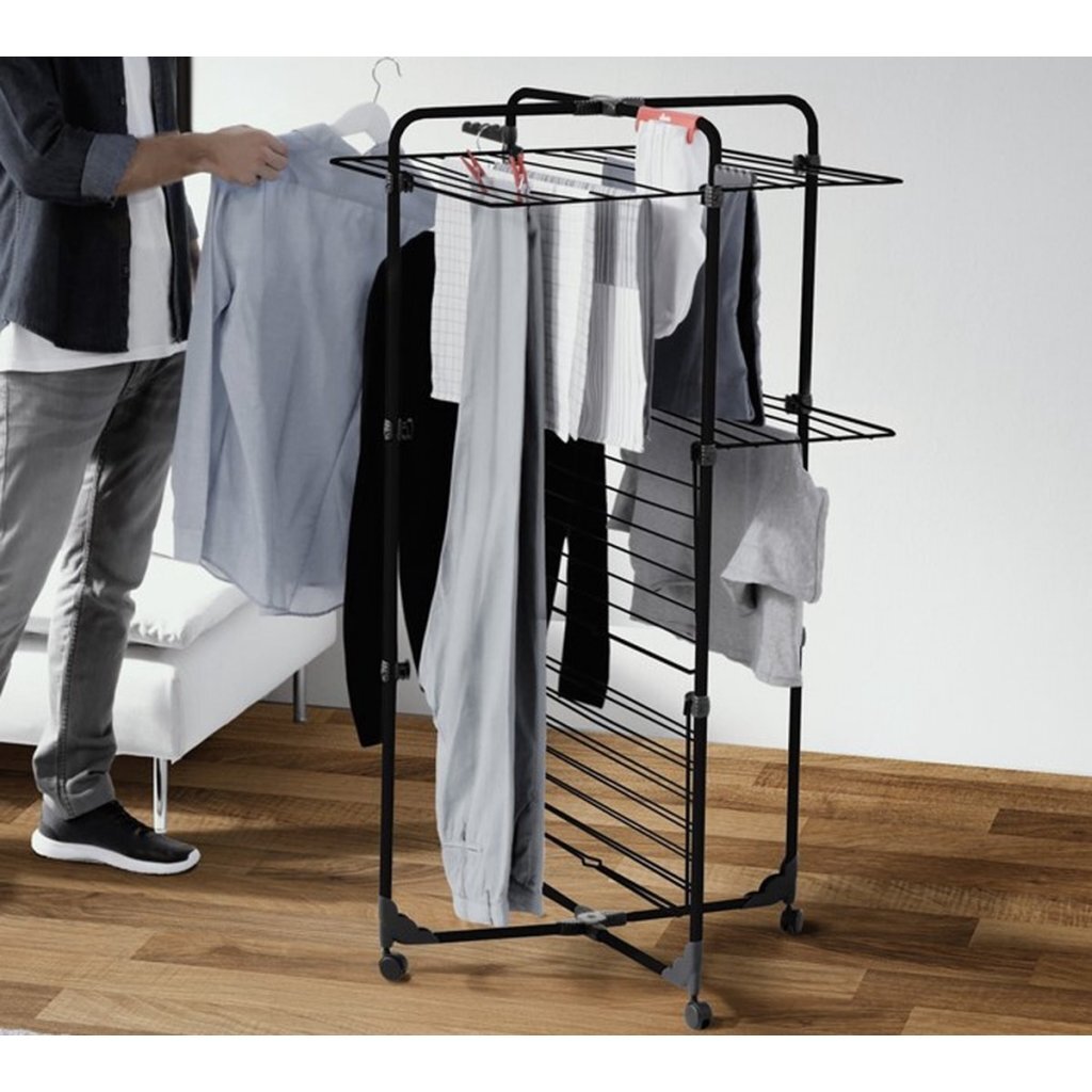 Dit compacte droogrek biedt meer dan30 meter drooglengteen is toch perfect geschikt voor kleine ruimtes. Deaanpasbare droogplateausmaken flexibele droogopties mogelijk waaraan verschillende groottes van wasgoed gehangen kunnen worden. Vouw het rek wanneer u het niet gebruikt, gewoon plat om hetgemakkelijk op te bergen. De zwenkwieltjes zorgen voor een moeiteloze mobiliteit, zelfs wanneer het droogrek is volgeladen met natte was.