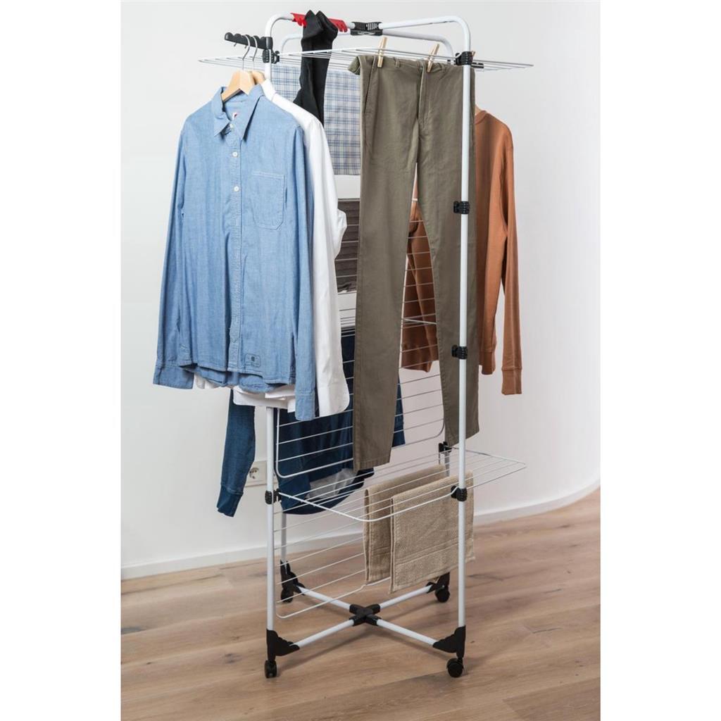 - 6 onafhankelijke plateaus geschikt om lange kledingstukken op te hangen of om delicate stukken plat te drogen