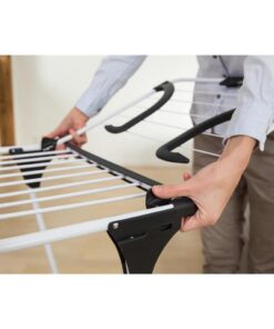 - Uitgerust met wieltjes, een vergrendelingssysteem voor de droogvleugels en een houder voor kleine stukken wasgoed
