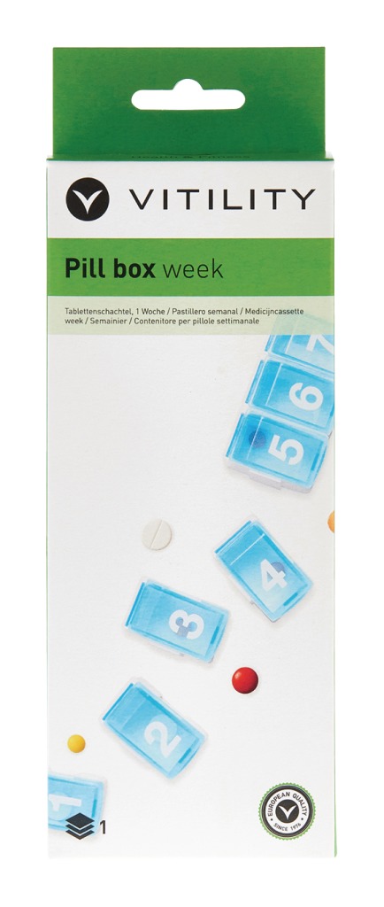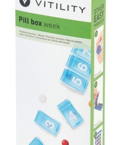 De Medicijndoos bestaat uit zeven grote genummerde compartimenten die eenvoudig in en uit elkaar kunnen worden geschoven, waardoor het mogelijk is om slechts een of enkele compartimenten mee te nemen. De zeven compartimenten geven de mogelijkheid om de medicijnen te verdelen per dag van de week.