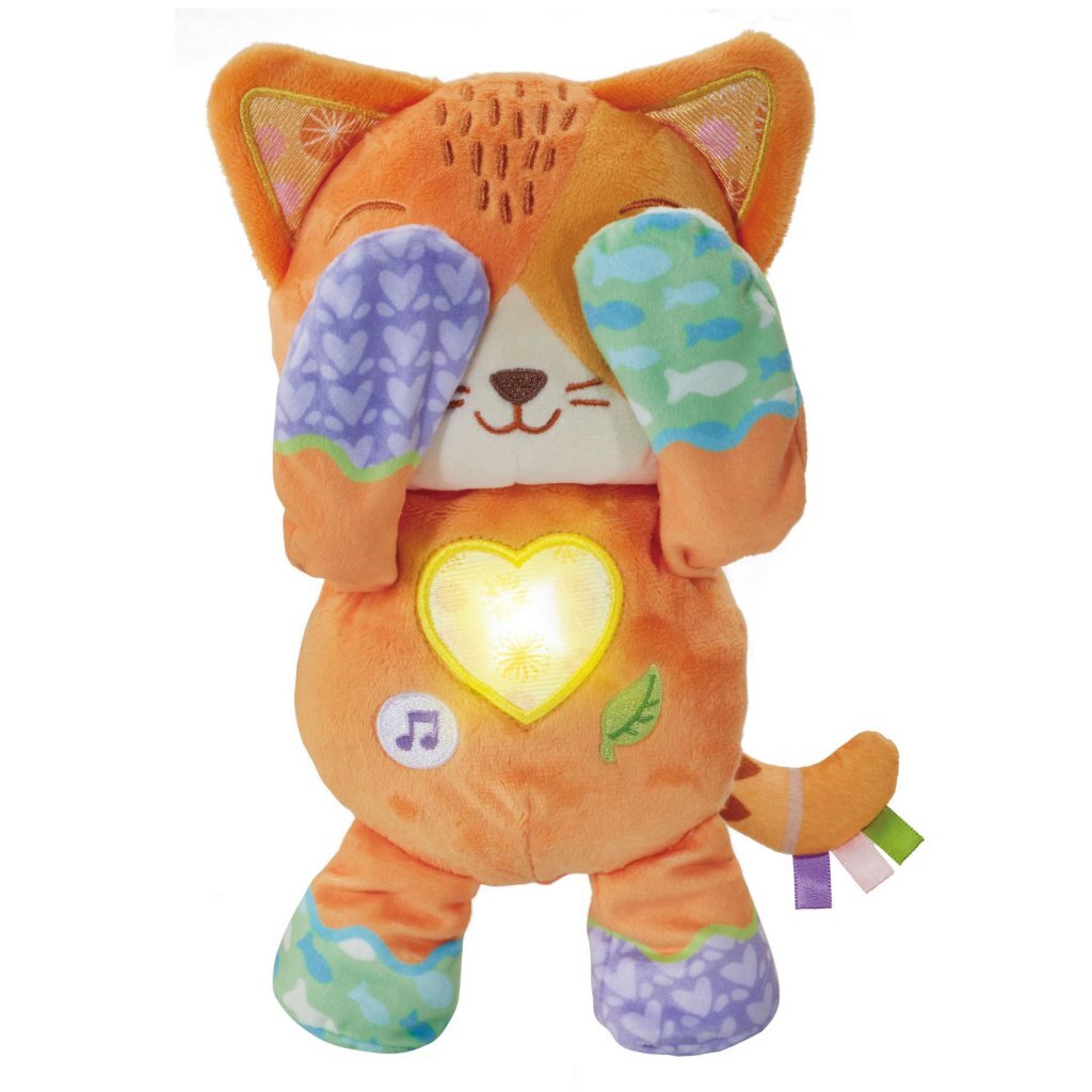 Miauw, waar ben je nou? Druk op het hartje om een leuk kiekeboe-spelletje te spelen en vrolijke reacties te horen wanneer het katje haar pootjes opzij beweegt of voor haar gezicht houdt. Druk op de muziek-toets om 15 vrolijke melodietjes en 4 gezongen liedjes te horen of druk op de natuurgeluiden-toets om verschillende natuurgeluiden te activeren. Kiekeboe! Ik zie je!