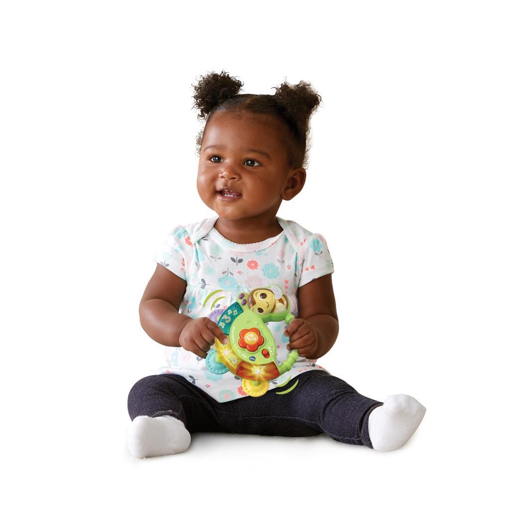 Maak muziek met de tamboerijn! Zoemie de Bij heeft zzzzin om te zzzingen. Druk op de bloem om vrolijke zinnetjes, gezongen liedjes en grappige geluiden te horen. Laat kleintjes kennismaken met cijfers, tellen en muziek. Schud de tamboerijn om grappige geluiden en melodietjes te horen. 10 melodietjes en 3 gezongen liedjes.