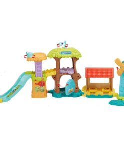 • Plaats de diertjes in de boomhut en laat ze via de glijbaan naar beneden rollen!