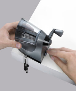 Puntenslijper inclusief tafelklem. Voor 8 verschillende formaten grafiet en kleurpotloden tussen de 7 tot 12 mm. potloodpunt formaat is verstelbaar. Afmetingen 13,1 x 7,4 x 13,1cm. Met titanium mesjes.