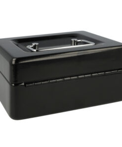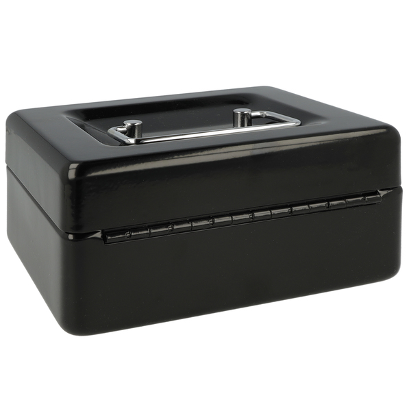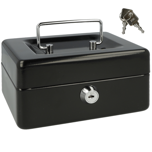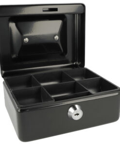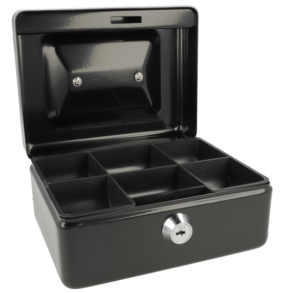 Met deze geldkist bergt u uw geld of waardevolle spullen veilig op. Deze geldkist gemaakt van staal wordt geleverd met 2 sleutels en heeft een kunststof inzet met 6 vakken voor munten. Doordat de geldkist een hangreep heeft die in de deksel valt kunt u de kist makkelijk opbergen. Afmeting: 152x120x79mm. Kleur: zwart.