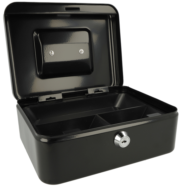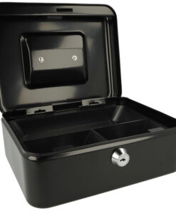 Met deze geldkist bergt u uw geld of waardevolle spullen veilig op. Deze geldkist gemaakt van staal wordt geleverd met 2 sleutels en heeft een kunststof inzet met 3 vakken voor munten. Doordat de geldkist een hangreep heeft die in de deksel valt kunt u de kist makkelijk opbergen. Afmeting: 200x161x89mm. Kleur: zwart.