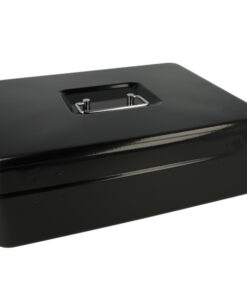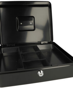 Met deze geldkist bergt u uw geld of waardevolle spullen veilig op. Deze geldkist gemaakt van staal wordt geleverd met 2 sleutels en heeft een kunststof inzet met 5 vakken voor munten. Doordat de geldkist een hangreep heeft die in de deksel valt kunt u de kist makkelijk opbergen. Afmeting: 301x242x91mm. Kleur: zwart.