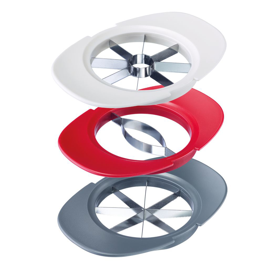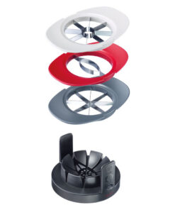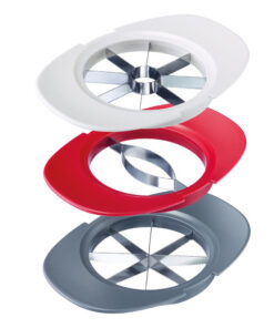 Met deze multisnijder kunt u appels, peren, tomaten, gekookte aardappelen, kiwi’s, eieren en zelfs mango’s snijden en het klokhuis verwijderen. De appelverdeler ontkernt en snijdt fruit gemakkelijk en snel in 8 uniforme stukken. De tomatensnijder maakt snel snijwerk dankzij de fijngetande messen en de mangoverdeler helpt je om mango’s gemakkelijk en snel doormidden te snijden. Dankzij de praktische snijplaat kunnen de inzetstukken veilig en ruimtebesparend worden opgeborgen. In tegenstelling tot conventionele fruitsnijmachines fixeert de praktische basis het snijmateriaal op zijn plaats, zodat het fruit in één handeling volledig kan worden gesneden.