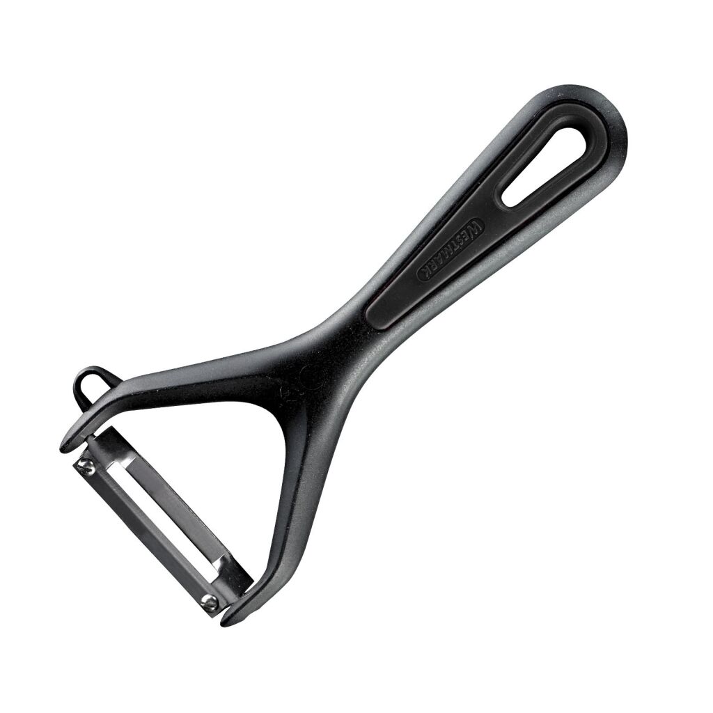Deze groente-/aspergeschiller van is ideaalvoor het schillen van ronde of langwerpige groenten en fruit zoals asperges, komkommer, aardappelen en appels. De dunschiller heeft ook een uitsteker voor rotte stukjes. Hij is flexibel,heeft eenvastgeschroefd mes dat zich automatisch aan de vorm van het voedsel aanpast. Hetmes van de dunschillerkan eenvoudig vervangen worden. Kleur: zwart/rvs.