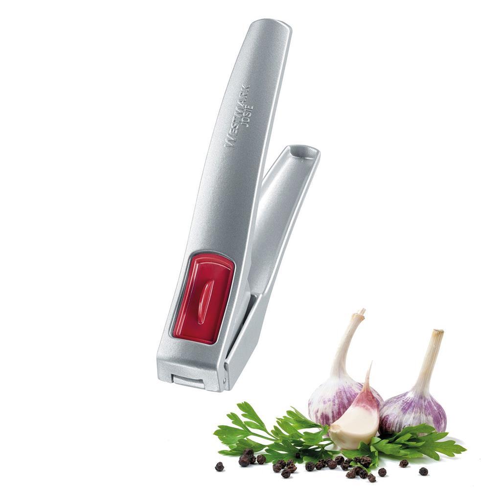 Westmark knoflookpers met een extra grote perskamer om meerdere tenen knoflooktegelijk te persen; voor het geurloos fijnpersen van knoflook met de hand. Ideaal voor knoflook, stukjes ui, gember of kappertjes; eenvoudige reiniging van het rooster dankzij in het handvat geïntegreerd reinigingselement – Eenvoudig in gebruik dankzij de praktische handgreep van hoogwaardig gegoten aluminium met een speciale voedselveilige coating. Kleur: zilver/rood.