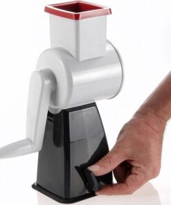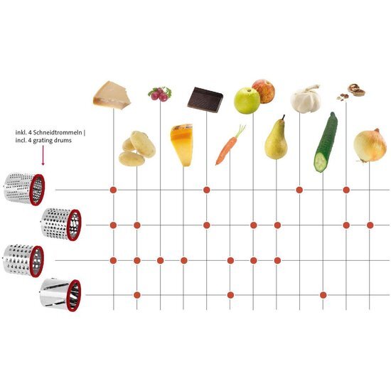 Groenterasp molen Multi. Deze groenterasp molen is voorzien van 4 roestvrij stalen snij-trommels: waarvan 3 trommels voor het grof, middel en fijn raspen en 1 trommel voor schijfjes. Raspen, snijden, schaven van fruit, groente, noten, chocola, kaas, enz. De trommels zijn gemaakt met een speciale ets-techniek, resultaat: extreem scherp en duurzaam. Met vinger bescherming. De trommels zijn heel gemakkelijk te wisselen. De sterke zuigvoet zorgt voor een veilige en stabiele stand op gladde oppervlakken.