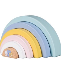 Deze Woezel en Pip regenboog uit de baby collectie is een aanwinst voor je baby of kinderkamer. Mooi als decoratie maar ook erg leuk om mee te spelen! De regenboog bestaat uit 6 houten delen die op en in elkaar passen, in de zachte kleuren blauw, roze, grijs wit en okergeel. Op het kleinste onderdeel is een fraaie print van Woezel, Pip en Buurpoes aangebracht. Met de halfronde vormen kan je kindje spelen met evenwicht en allerlei creaties maken door zijn of haar fantasie te gebruiken. Wat denk je van een treintunnel, een huisje voor kleine poppetjes of bergen voor autootjes? De mogelijkheden zijn eindeloos! Geschikt voor kinderen vanaf 12 maanden.