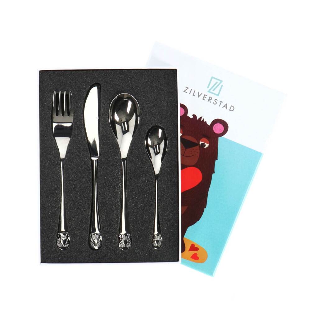 De bestekonderdelen zijn voorzien van een beer met hart in reliƫf. Het besteksetje is gemaakt van RVS 18/10. Poetsen is niet nodig en het besteksetje mag in de vaatwasmachine. Bestaat uit een vork, lepel, mes en dessertlepel en wordt geleverd in een bijpassende geschenkverpakking.