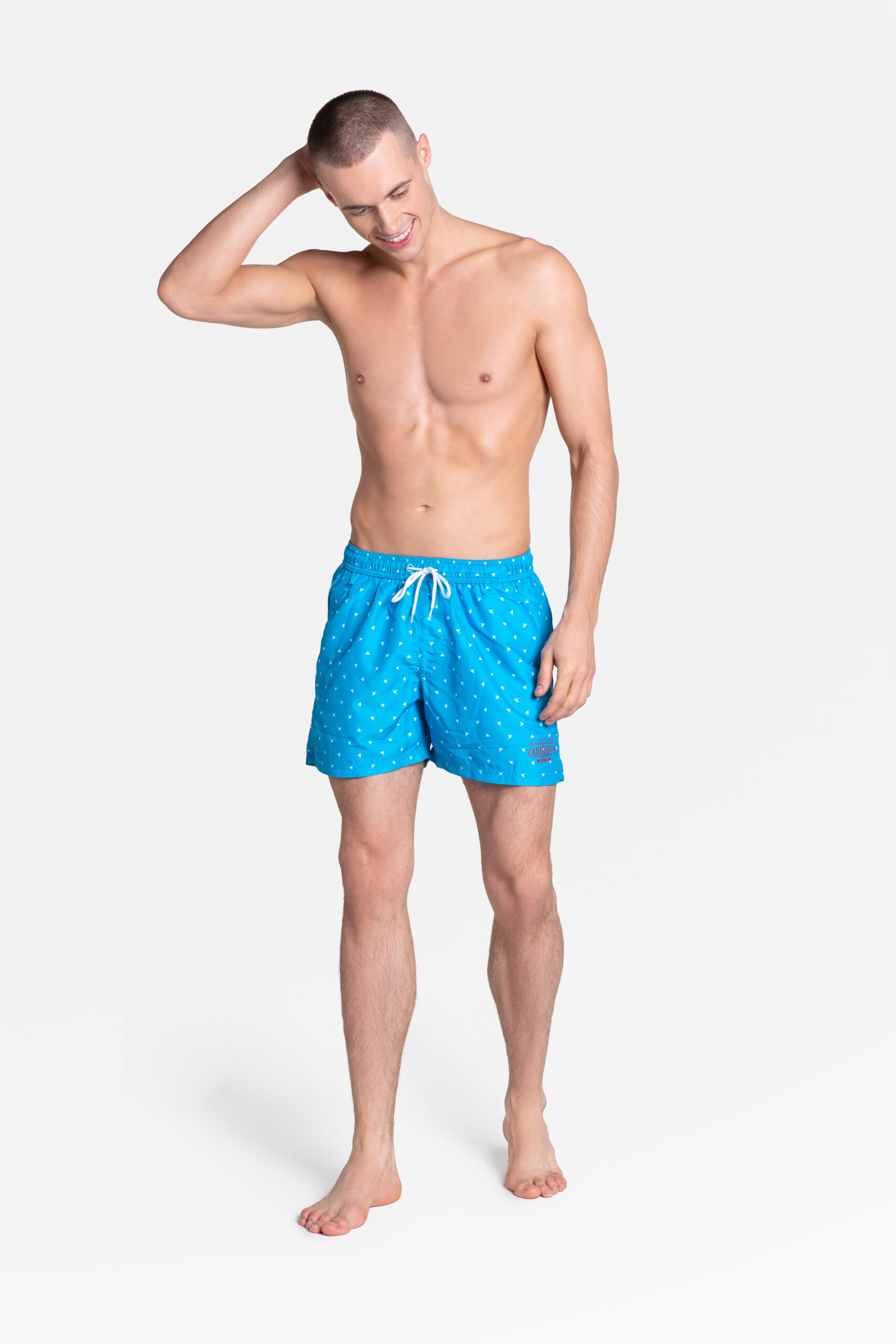 Zeer comfortabele, losse, gevoerde zwemshort uit de nieuwste Henderson-collectie, editie zomer 2021. Hij valt op in een prachtige blauwe kleur (in een mooie tint), bedekt met een piepklein motiefje. Comfortabele pasvorm: comfortabele, elastische, zachte tailleband met extra trekkoord om de omtrek aan te passen. Sneldrogende stof. Achterzak met riemlus.