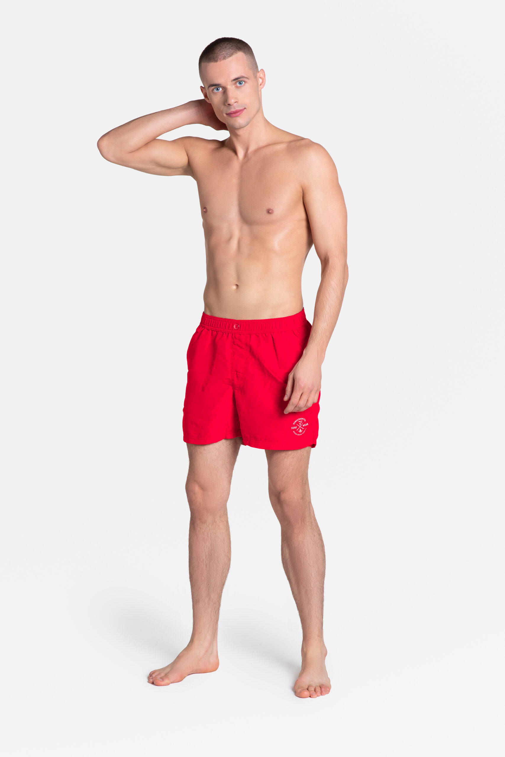Een loszittende, sportieve zwembroek die ook dienst doet als strandkleding, iets wat je op het strand kunt dragen. Glad, met een opvallende applique op de dij, ze zien er geweldig uit. Binnenin is er een voering en bovendien een koord om de omtrek te regelen, in de taille is er een elastische band. Elastiek in de taille. Achterzak met riemlus.